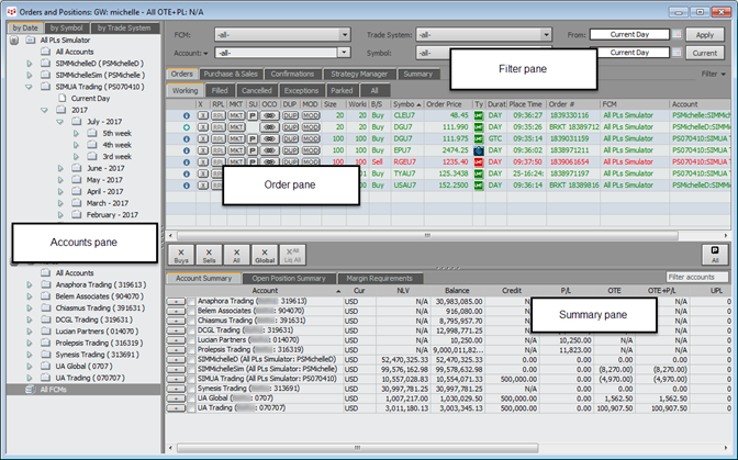 •Filter: controls used to filter Order and Summary panes, including account, FCM, symbol, date, and trade system.