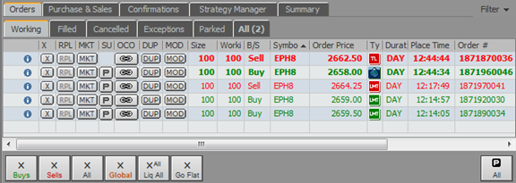 •Orders: Displays order information on six tabbed windows: working, filled, cancelled, exceptions, parked, and all.