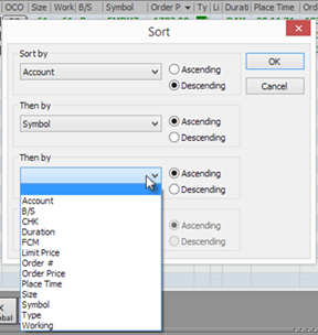 If you are logged on to trade, and Current Day is selected (Filter pane > date), then you can filter using these columns: Account, Algo strategy, Buy/Sell, CXL Time, Duration, Last Fill Time, Order #, Order Check Mark, Order Comment, Order Filled Size, Order ID, Order Size, Order Working Size, Park Until, Place Time, Server Order #, Status, Symbol, Sys ID, Ticket #, Type, User, Visible Size.