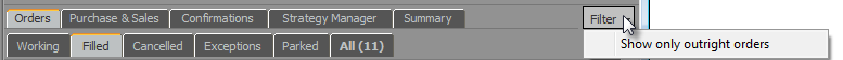To hide synthetic strategy leg orders from the Orders and Positions display, click the Filter button, then select Show only outright orders. It is off by default.