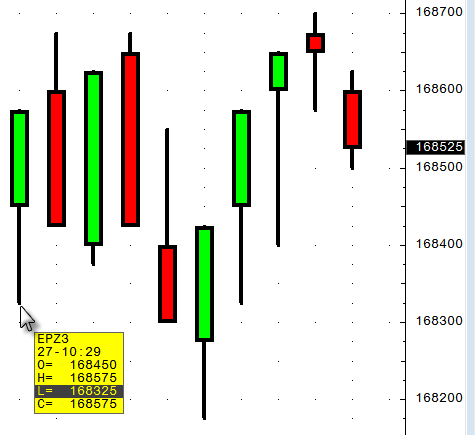 Bars that are neither up nor down are colored black (can be changed in preferences). If open < close, then highlight up (green) If open > close, then highlight down (red) If open = close, then neutral (black) |