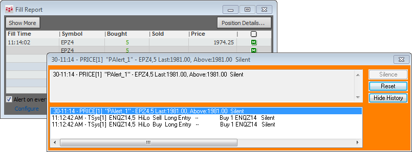 Once any alert is triggered, the trigger action occurs (order, sound, display, email) and a notification window is displayed.