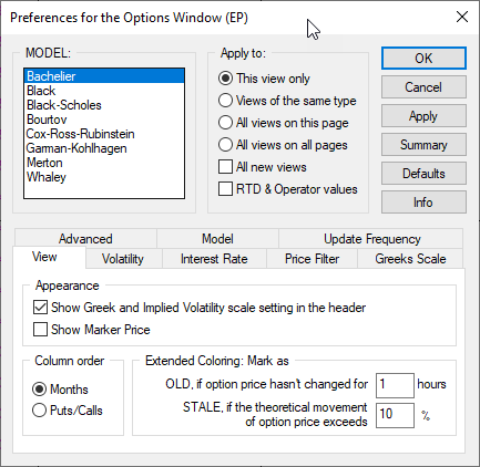 •View settings allow you to show or hide Greek and implied volatility scales, order columns, and set extended coloring parameters.