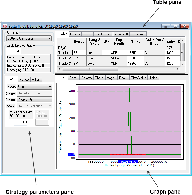 Strategy Analysis is a tool for analyzing – through changes in underlying price, time, volatility, and interest rate – the theoretical behavior of an options strategy, which consists of one or more option positions and/or underlying product positions.