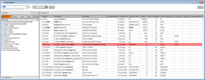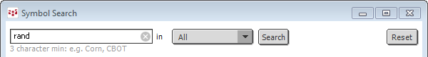 You can search for a symbol by entering the symbol, part of the description, the exchange, the type, or the exchange symbol. Results that match any of those data points are returned. For example, “rand” returns the symbol RAND, Rand Mining Limited, and USD/South African Rand.