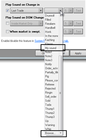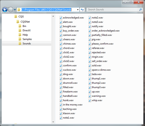 •Save them to the directory (C:\Program Files (x86)\CQG\CQGNet\Sounds), and they will be included in the sound drop-down menus.