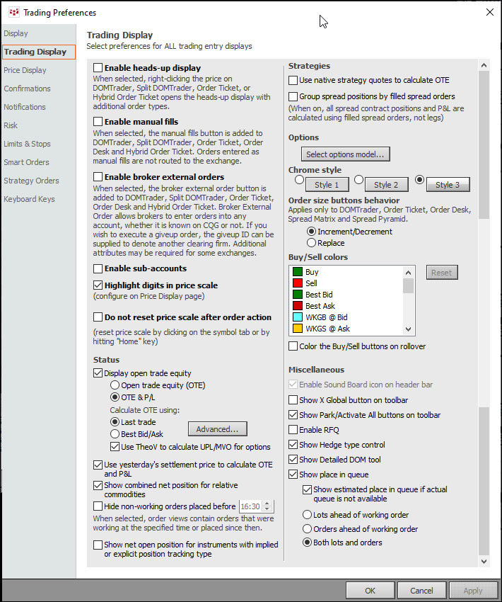 Choose system behavior, display qualities, and button preferences that apply all trading applications.