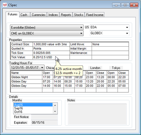 In this example, the tick for the front month is 6.25, while the tick for contracts more than two months out from the front month is 12.5.